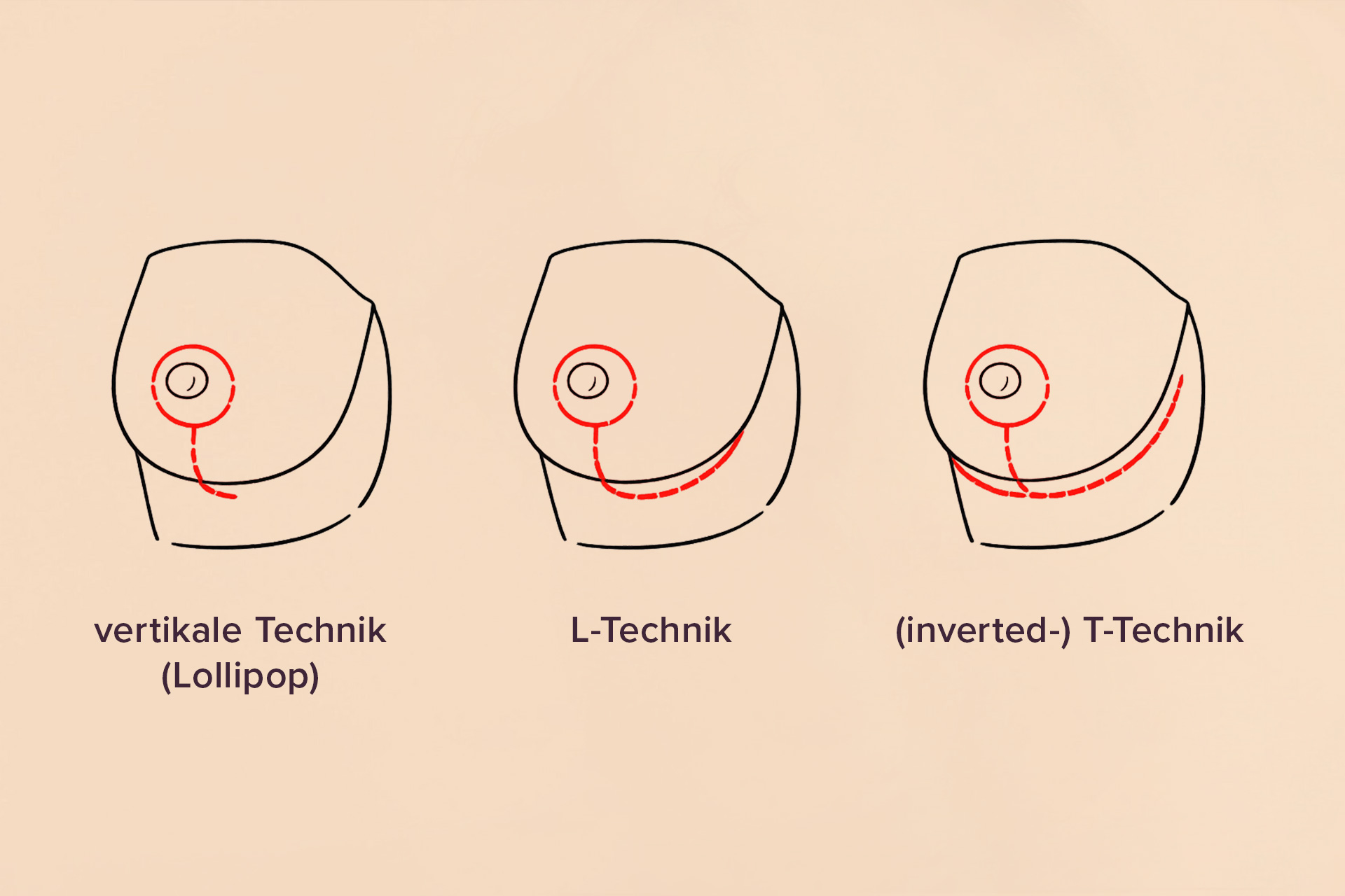 Wir bevorzugen, wenn möglich, die vertikale Technik, da sie eine schonendere Narbenbildung ermöglicht. Bei sehr großem Brustvolumen oder breiter Brustform kann jedoch eine erweiterte Technik wie die Inverted-T-Narbe medizinisch sinnvoller sein.